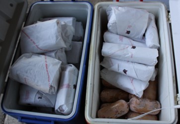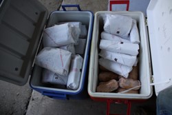 A half hog fills a couple typical ice chests.